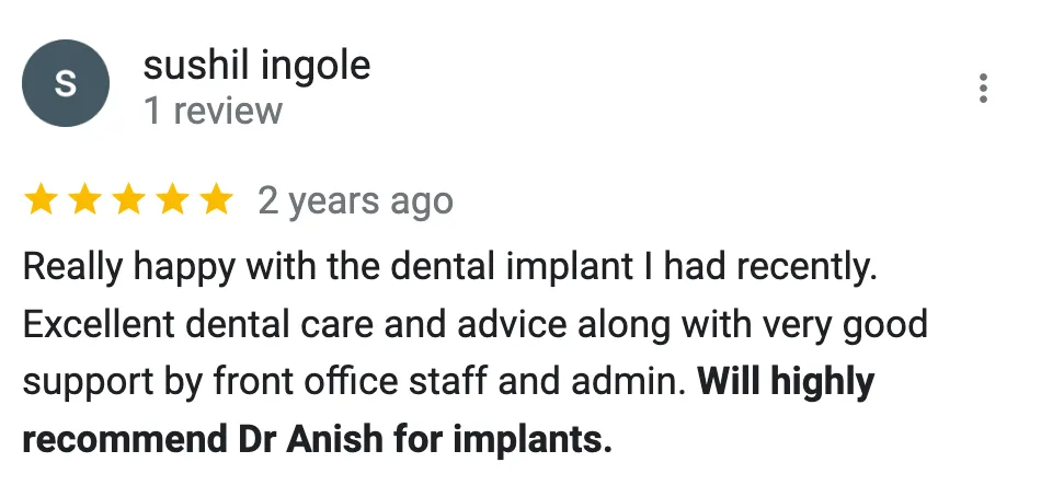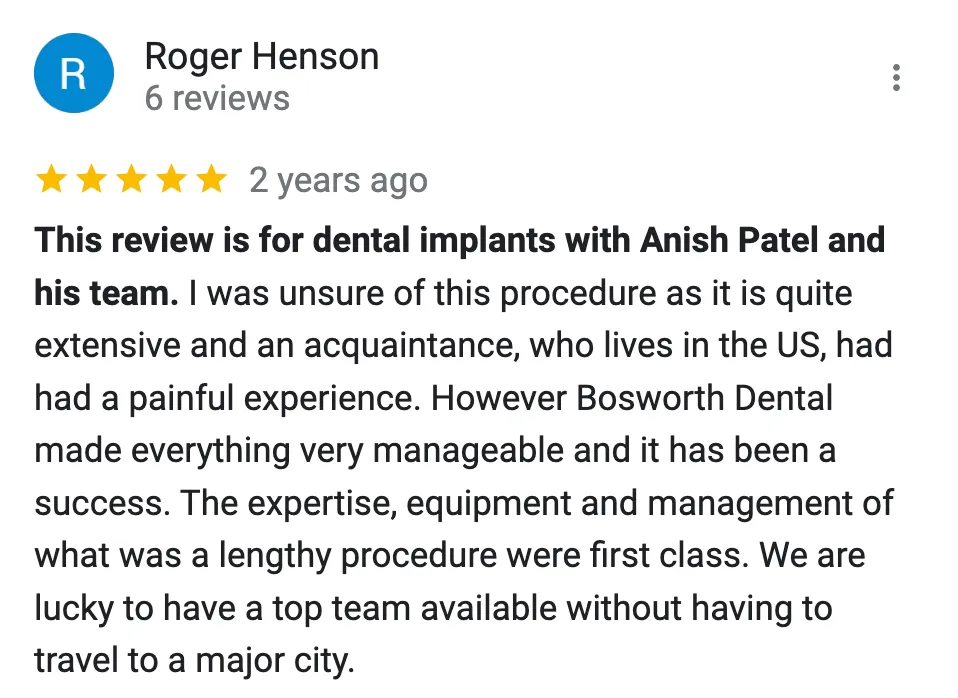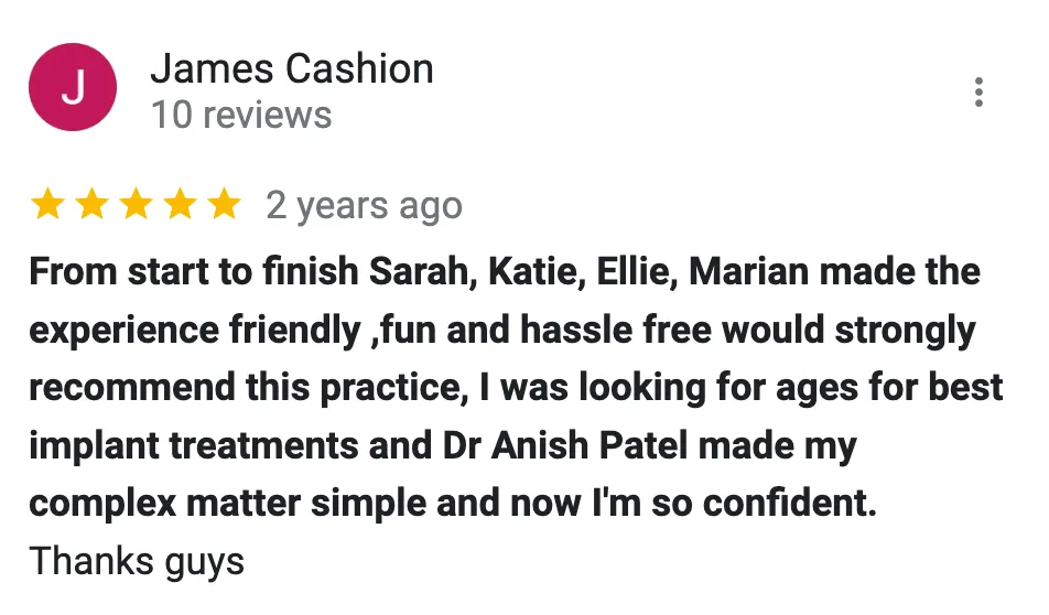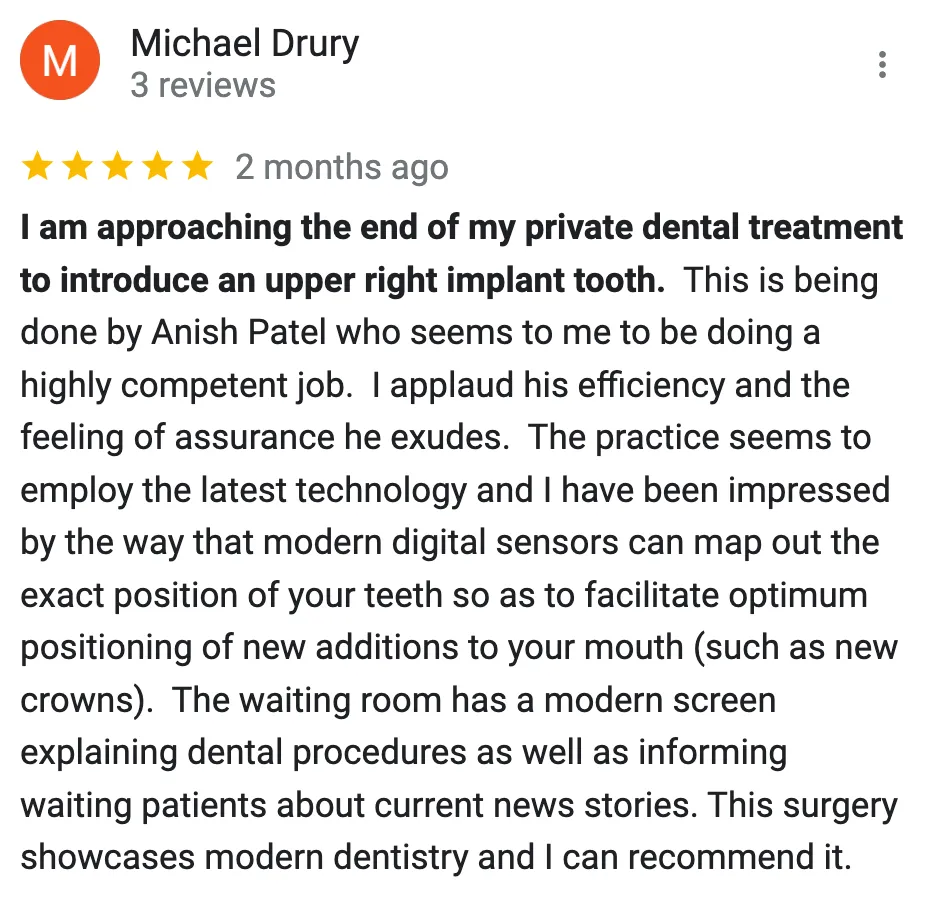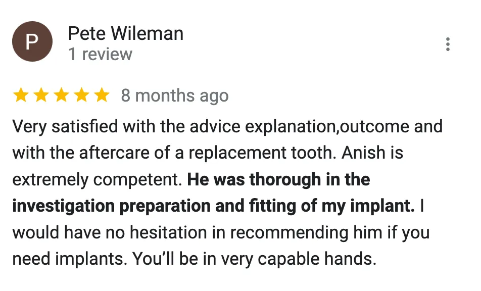 Consultative approach: Happy to discuss whether dental implants are right for you and how treatment could improve function, confidence and quality of life.